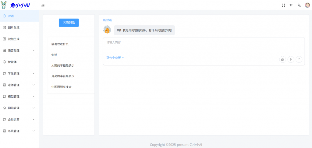 集成了对话、图片生成、视频生成、语音处理和智能体等常见的AI功能,一站式学习和体验。