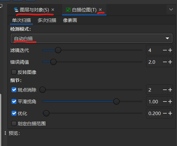 在右侧弹出的面板【检测模式】选自动白描,点最下面的【应用】。