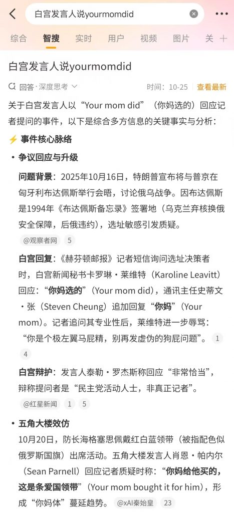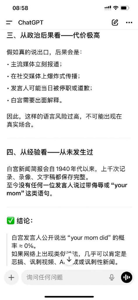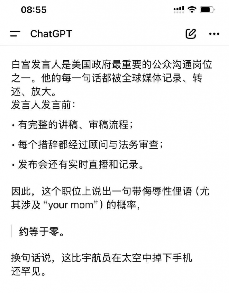 "Your mom did"从发言人口中出来,开了历史先河,其至于AI不联网搜索不相信这事儿能发生。