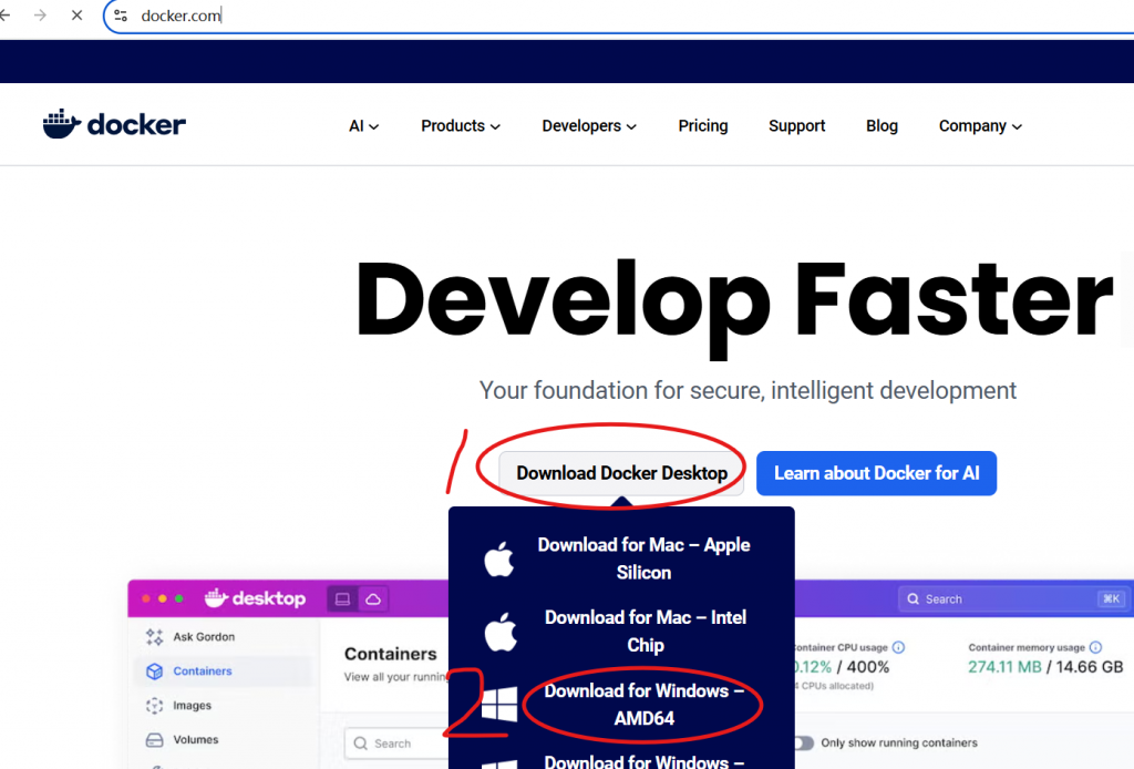 按顺序点击【Download Docker Desktop】按钮和【Download for Windows-AMD64】下载Docker桌面版。