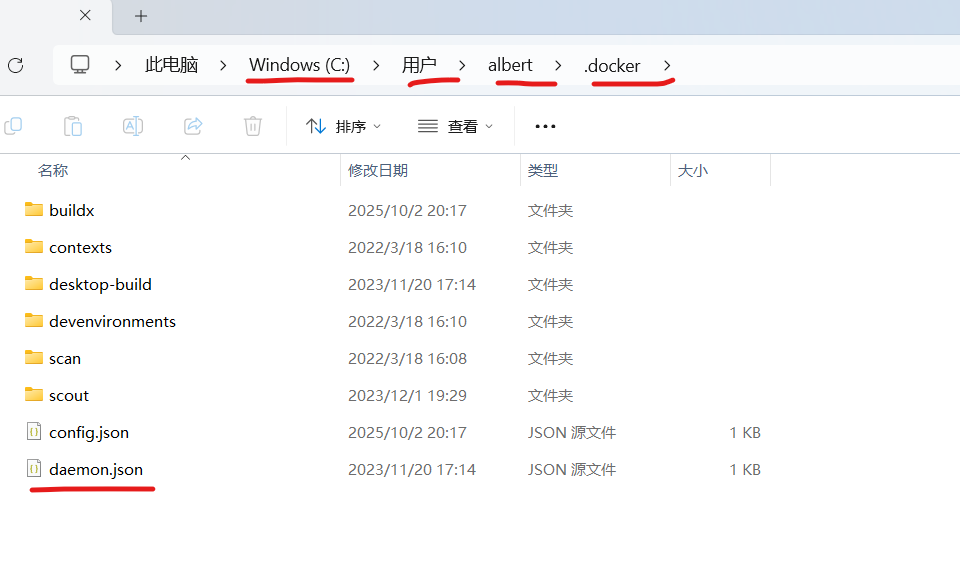 2.1 添加国内镜像源,加速docker。依次点开C盘->用户->(你的用户名)->.docker,再打开daemon.json 编辑。