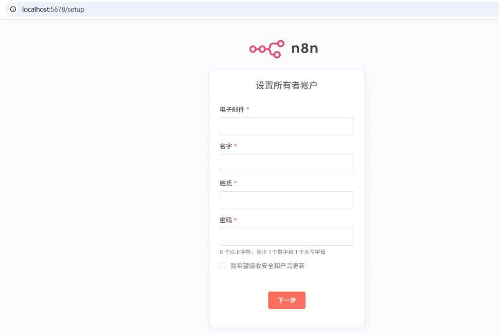 填好邮箱和相关信息,密码用一个简单的就行,例如N8n12345,本地安装不用担心安全问题。